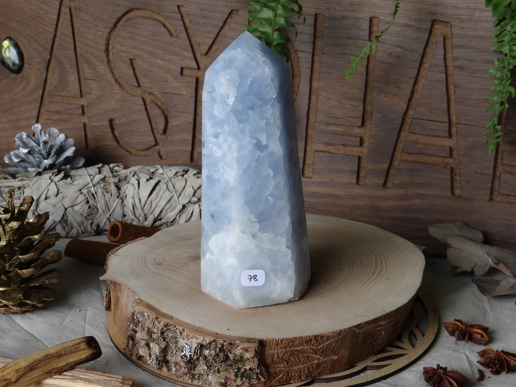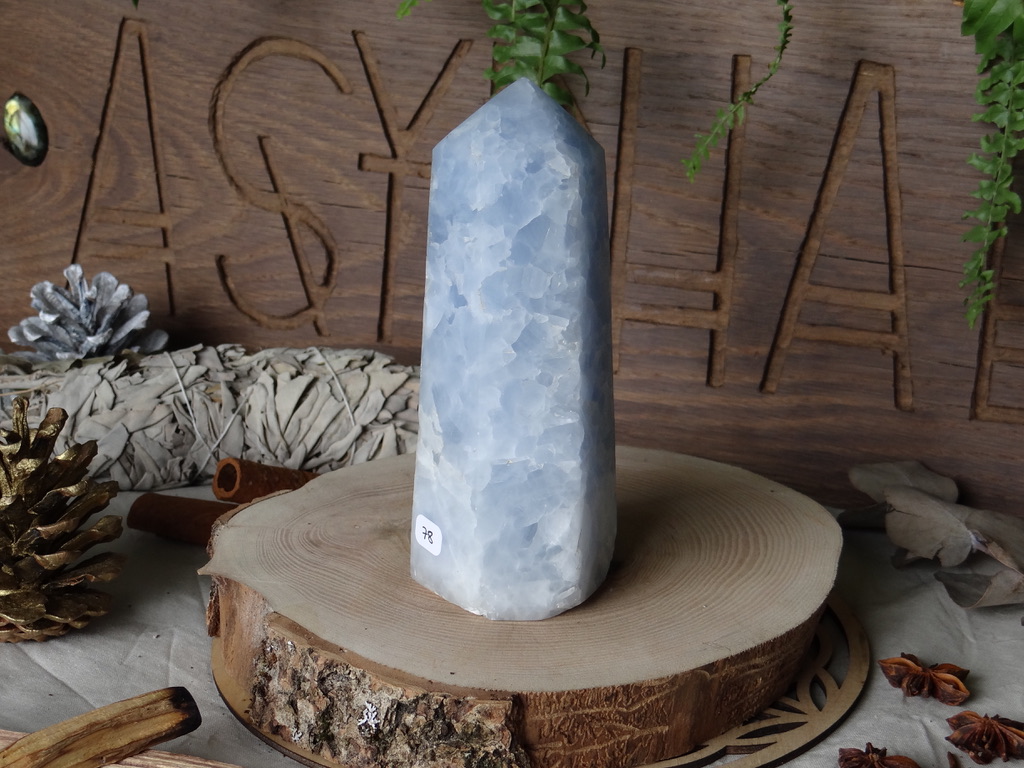 Il s’agit d’une Calcite Bleue en provenance de Madagascar. Cette pierre a été taillée en forme de pointe.