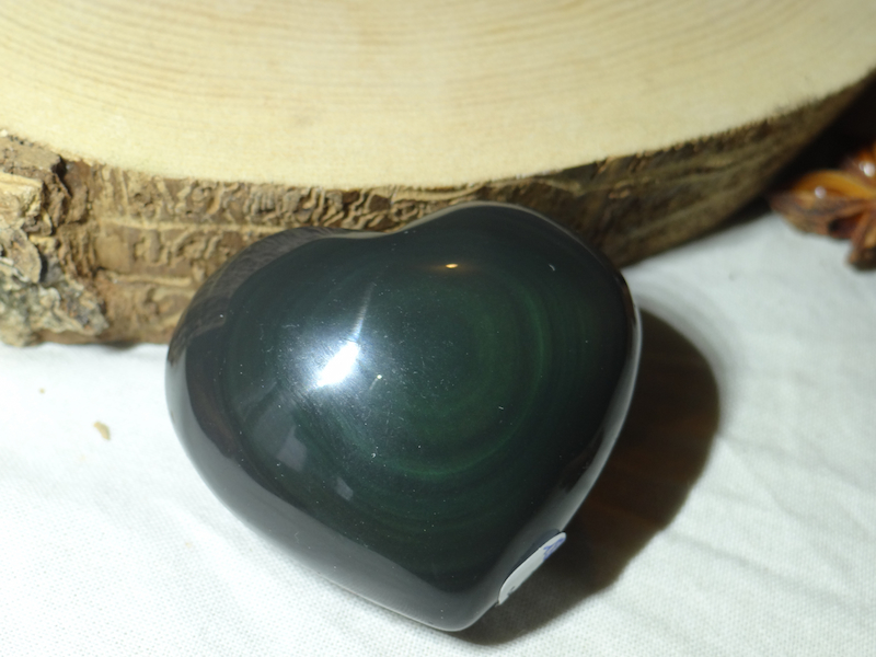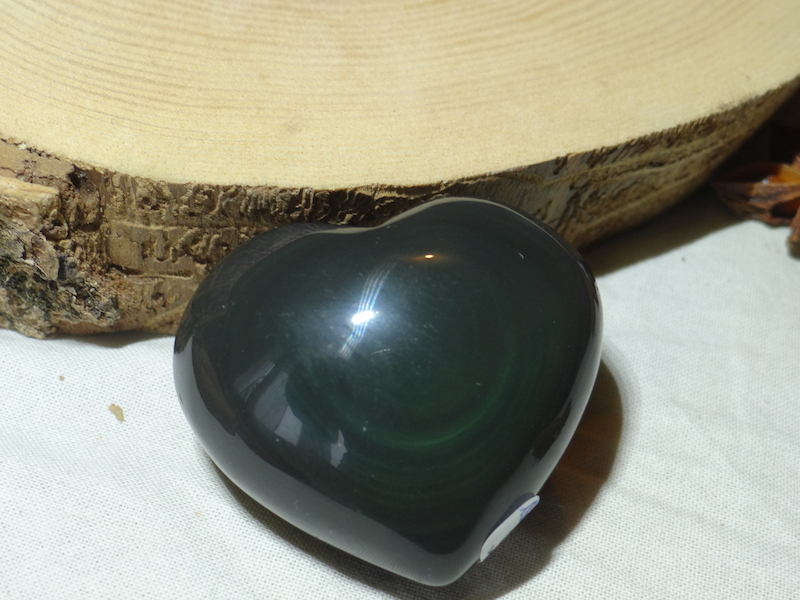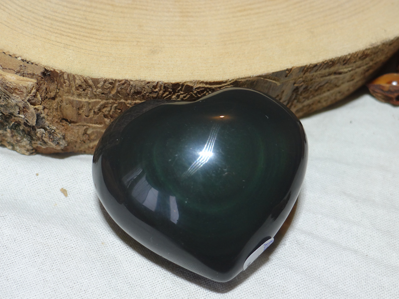 Il s’agit d’une Obsidienne Oeil Céleste en forme de cœur. Elle a été taillée par l’Homme pour révéler toute sa beauté. Ce minéraux est en provenance directe du Pérou.