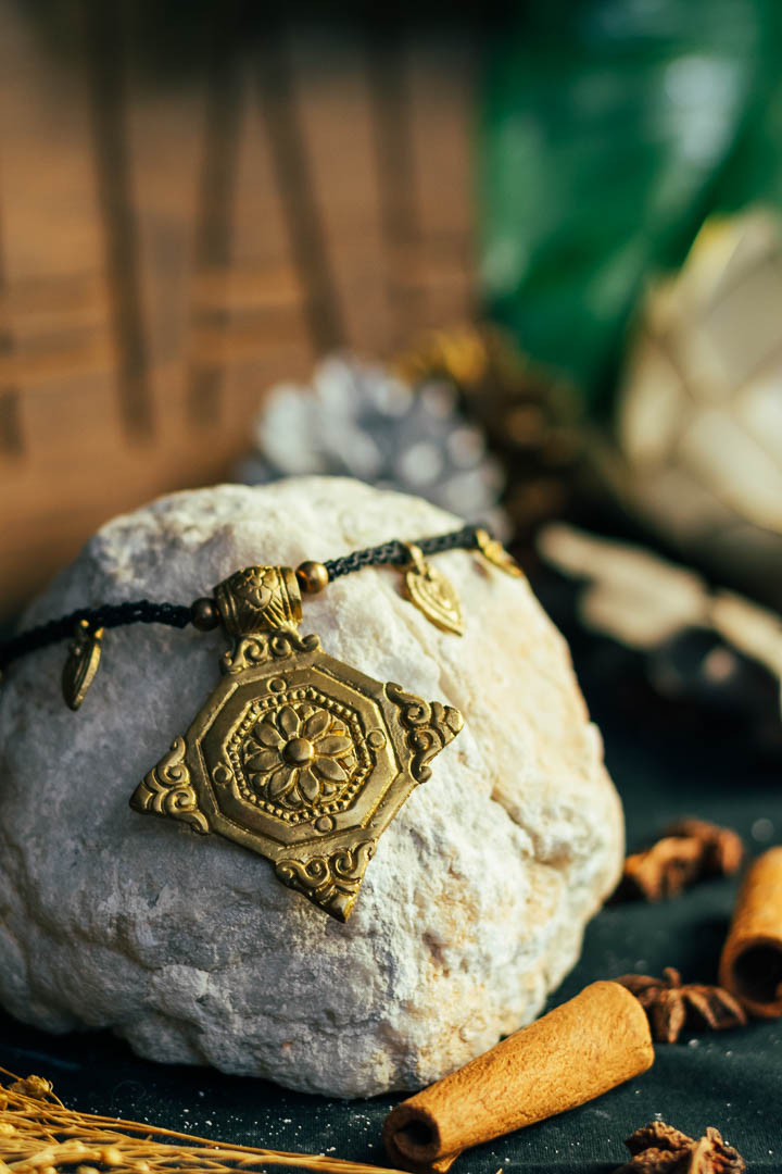 Ce collier est composé d’une breloque en laiton en son centre et de breloques en laiton.