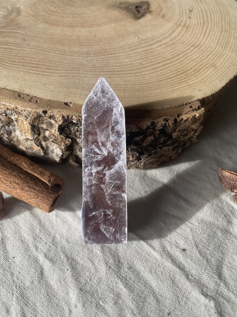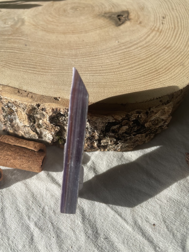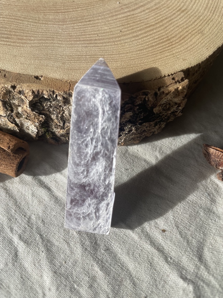 Il s’agit d’une Lépidolite en provenance du Portugal, taillée en forme de pointe.