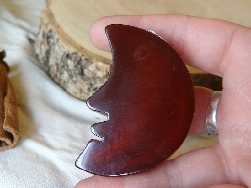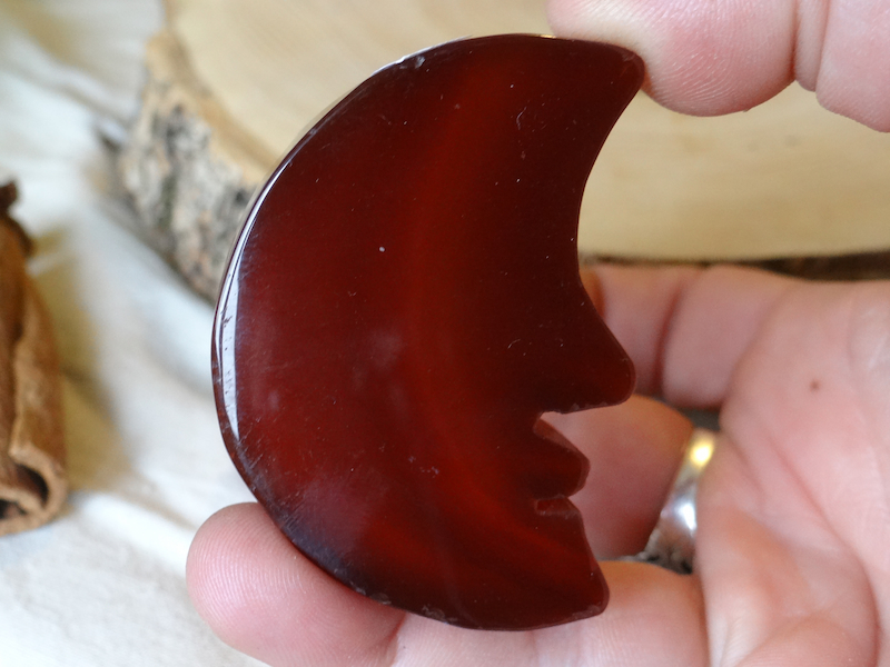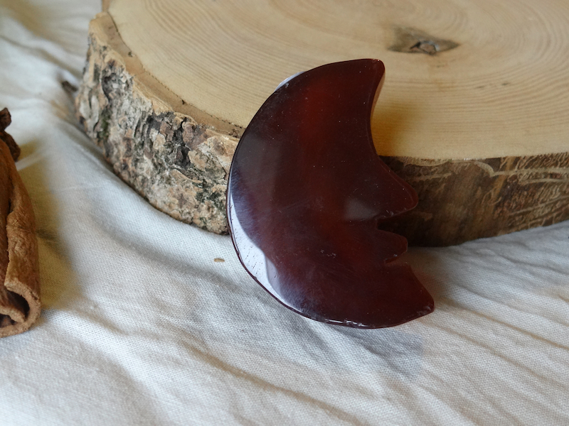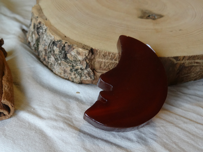 Il s’agit d’une Cornaline en forme de lune, elle a été taillée par l’Homme pour révéler toute sa beauté. Ce minéraux est en provenance directe de Madagascar.