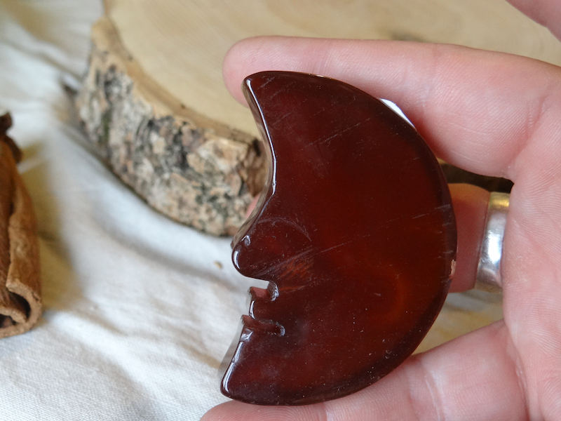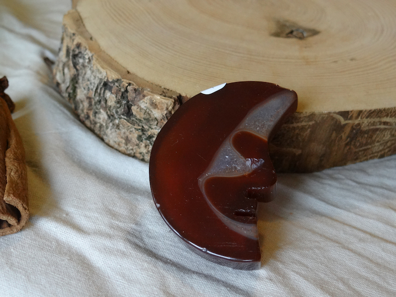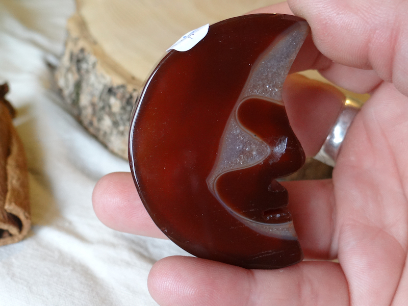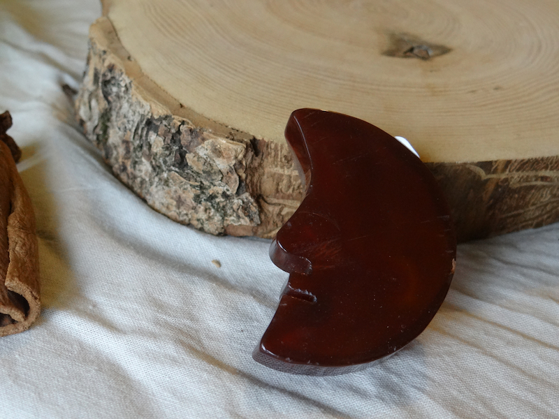 Il s’agit d’une Cornaline en forme de lune, elle a été taillée par l’Homme pour révéler toute sa beauté. Ce minéraux est en provenance directe de Madagascar.