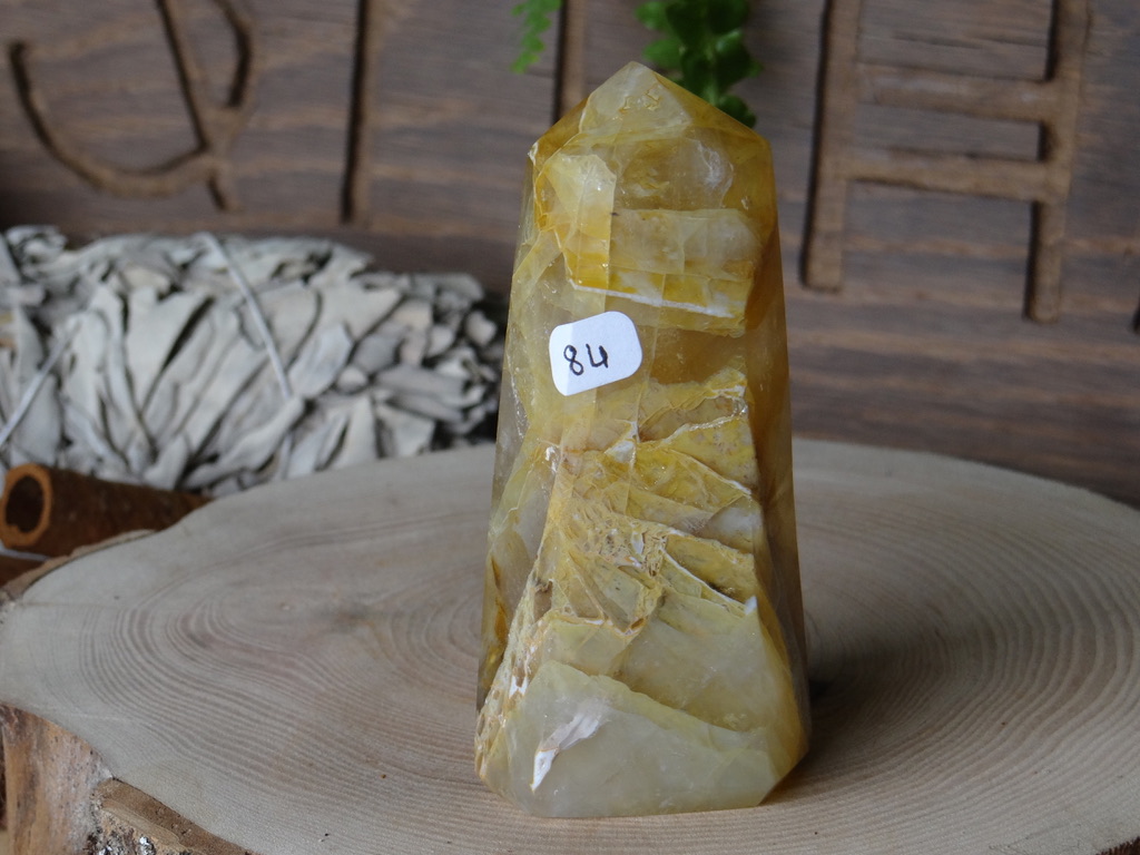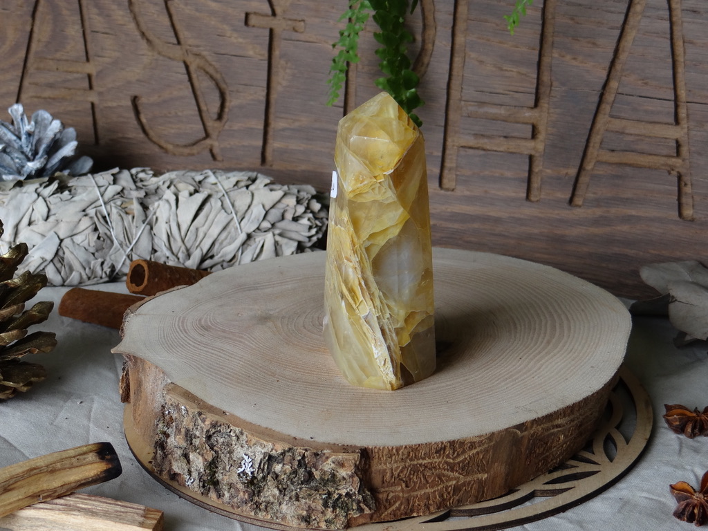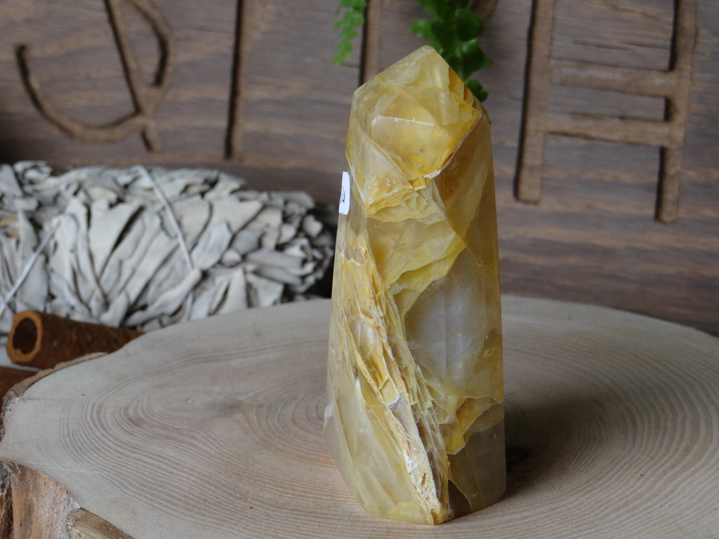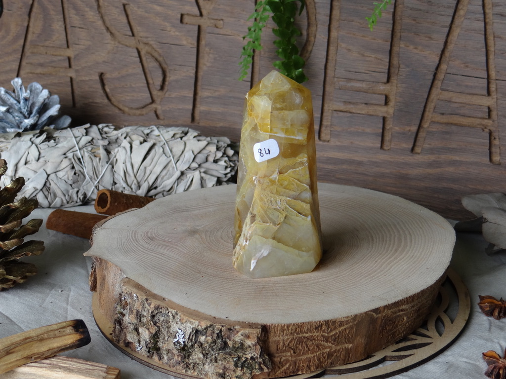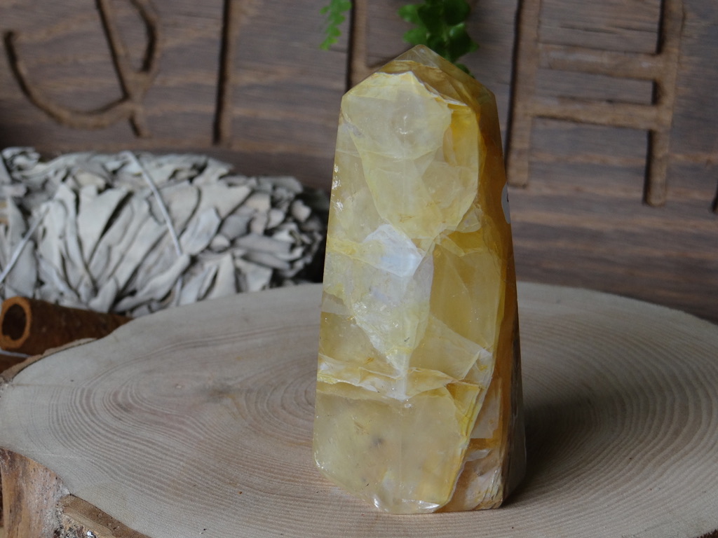 Il s’agit d’un quartz hématoïde jaune en provenance de Madagascar. Cette pierre a été taillée en forme de pointe.
