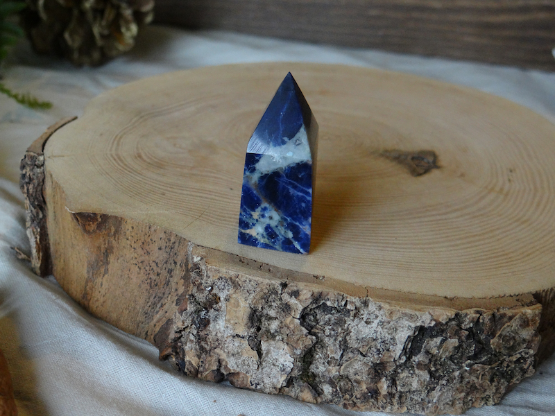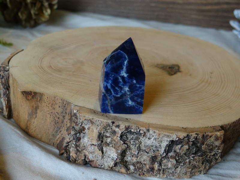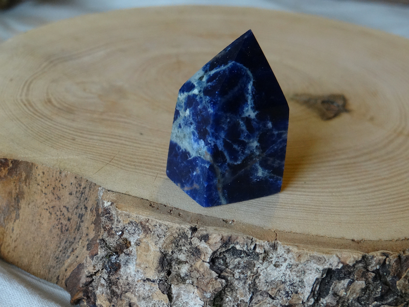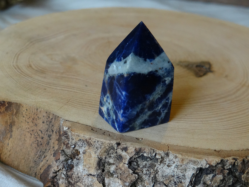 Il s’agit d’une Sodalite en forme de pointe, elle a été taillée par l’Homme pour révéler toute sa beauté. Ce minéraux est en provenance directe d’Afghanistan.